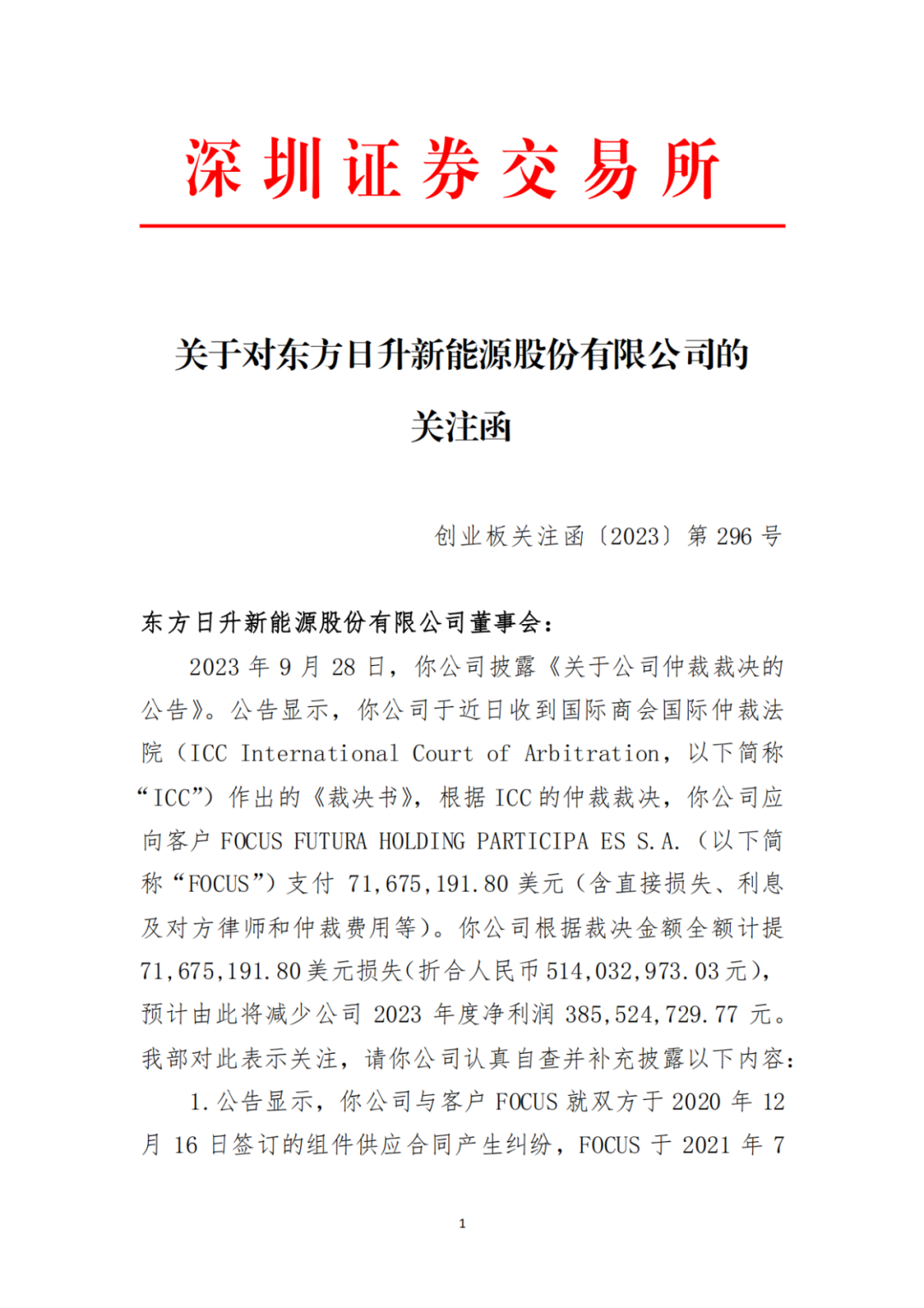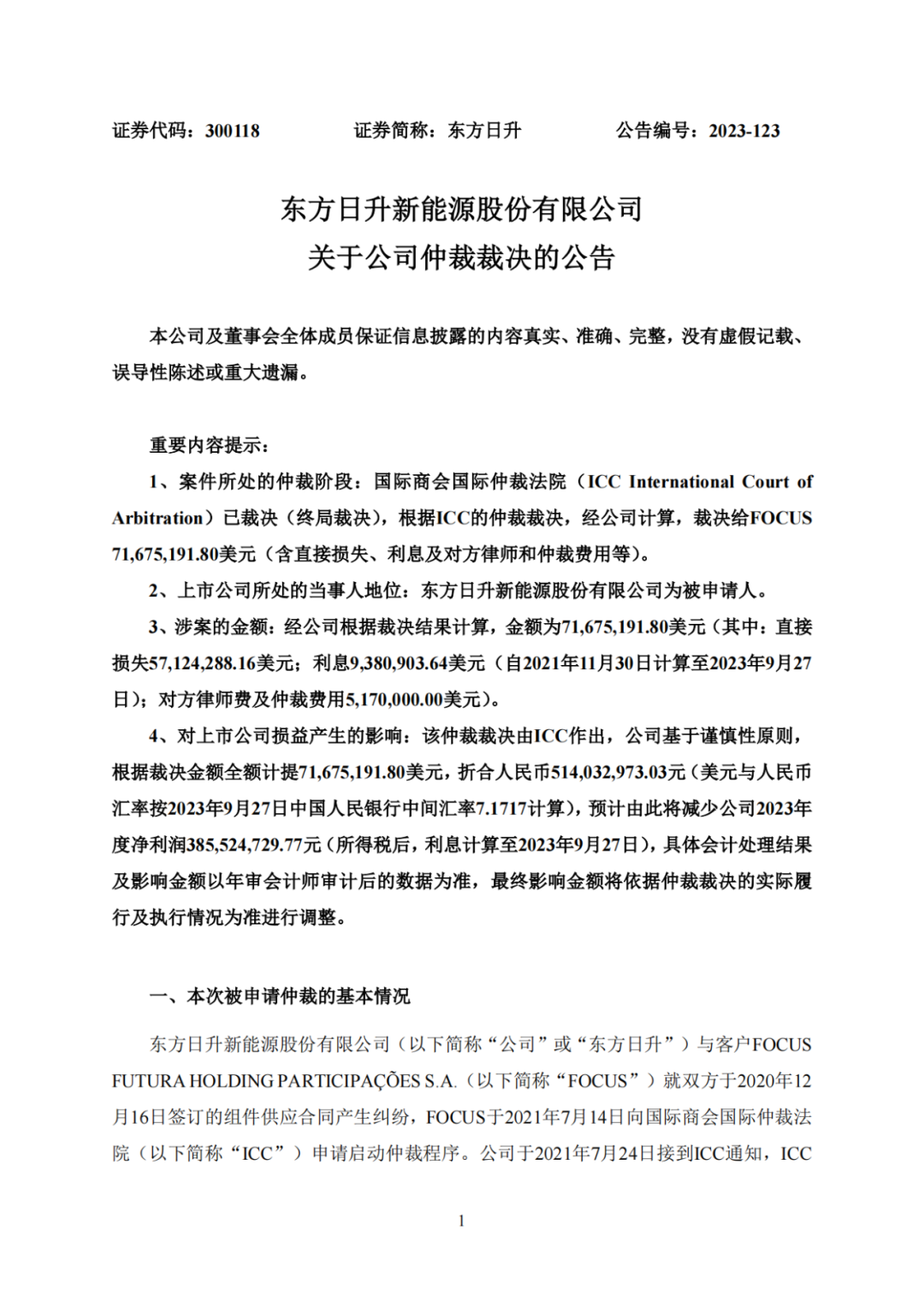 2023 年 9 月 28 日,東方日升發(fā)布《關(guān)于公司仲裁裁決的公告》稱(chēng),收到ICC”的《裁決書(shū)》,需向客戶(hù)“FOCUS”支付 71,675,191.80 美元(含直接損失、利息 及對(duì)方律師和仲裁費(fèi)用等),因此要計(jì)提折合人民幣5.14億元損失, 預(yù)計(jì) 2023 年度凈利潤(rùn) 3.855億元。(公告原文附后)