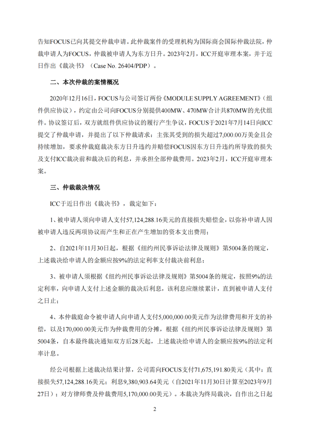 2021 年 7 月 24 日,東方日升接到 ICC 通知,告知 FOCUS 已向其提交仲裁申請(qǐng);