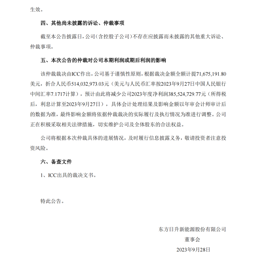 2023 年 9 月 28 日,東方日升發(fā)布《關(guān)于公司仲裁裁決的公告》稱(chēng),收到ICC”的《裁決書(shū)》,需向客戶(hù)“FOCUS”支付 71,675,191.80 美元(含直接損失、利息 及對(duì)方律師和仲裁費(fèi)用等),因此要計(jì)提折合人民幣5.14億元損失, 預(yù)計(jì) 2023 年度凈利潤(rùn) 3.855億元。(公告原文附后)